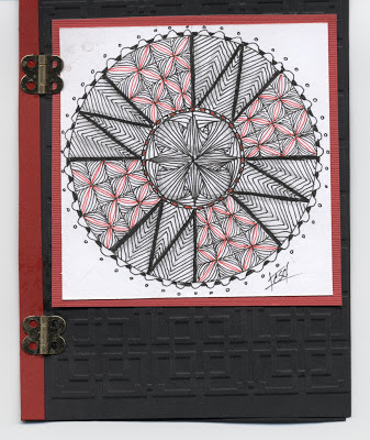 Aside from tangling, card making and scrapbooking are high on my favorites list. I love working with paper. Always have. So when I discovered CardzTV, I was delighted. It is so much fun watching the videos, checking out everyone's work and just getting inspired. This week there were two different challenges I worked on. One was to use only the colors red, black, and white. That is a combination I love. On anything. It just speaks of elegance in my opinion. My card does have 2 little gold hinges, but I think that is okay. At least I hope so.