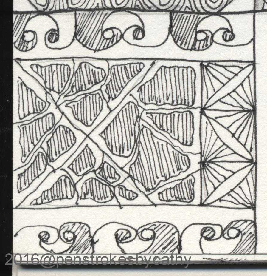 Then onto my Diane Clancy challenge, which I feel the exact opposite about - I love it. It reminds me of a kitchen wall for some silly reason. The letters we had to use were PWZ. I chose the following tangles - pax, wallbucket, and zero-in. Then I added a couple of colors.